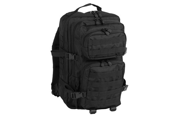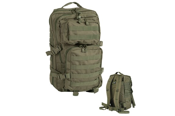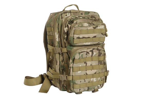Ryggsäck av slitstark polyester Ett stort fack, ett mindre och två små fack, alla med tvåvägs dragkedja. Bärhandtag på toppen. Vävband täcker hela framsidan och på sidorna för fastsättning av MOLLE / MTS tillbehör och utrustning på utsidan. Vadderad rygg, axelremmar och bälte med snabbspännen. För kompressionsremmar samt bälten längst ner för infästning av sovsäck etc.