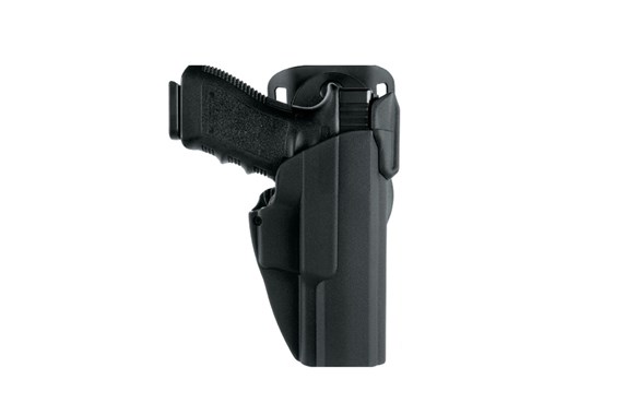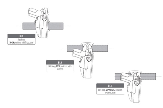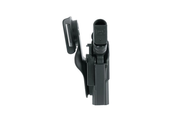 The EVOLUTION5 system is composed of fixed, rotating and removable belt loops, in order to obtain several inclinations ans positions. The patented high rotating function of the belt loop, consents the holster-arm group to be higher, respect to the operators sitting position in a determined way and of at least 180 mm in respect to the vertical position, and cqn also rotate both ways depending on the needs of the operators. Besides this, it can be applied to the holster with a three-point application, integrated and personalized with a large range of spacers and distance plates, which permit the customisation of the inclination, the height and the distance from the operators body, depending on the operating needs. MLM Modular lock Mechanism A locking system which operates at the moment of the insertion of the weapon in the holster, preventing the theft of the weapon. With a simple, fast and instinctive pressure of the thumb the lock system is automatically disactivated. LS2 Lock System 2 A removable lever that is located under the handle of the arm which acts on the mechanism MLM blocking the trigger of the weapon; if kept inserted, at the moment of the introduction of the arm in the holster, allows a total block of the system MLM. However, the system is connected or disconnected with a light and quick pressure of the finger. PTG Protected trigger guard. PS Pistol Model Imprinted. RN Rotating Nato Belt Loop. RSP Rear Sight Protection Assembled on the holster, consents the protection of the rear sight. Media och övrig teknisk information |