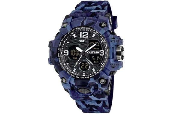 - Calypso K5855/2 mens watch features a blue black camouflage plastic case, perfect for those looking for a dynamic street style.