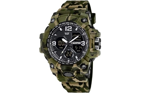- Extrovert and cool design - bold and bold colors; Calypso K5855/3 watch features a vibrant green and black camouflage design that stands out for its freshness and unique style