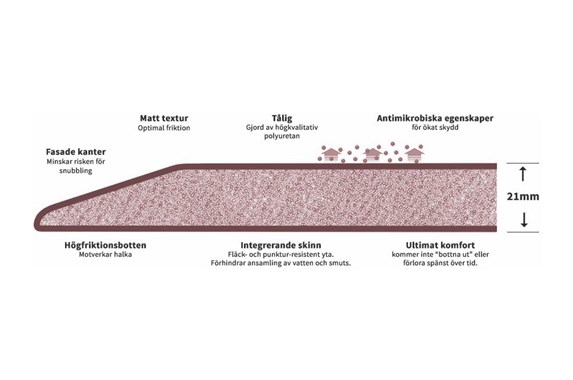 INZONE™StandMat består av ett mönstrat ytskikt för yttersta komfort, kärna av polyuretan för optimal avlastning för rygg, ben och fötter och en behandlad undersida så att INZONE™StandMat ligger still. Tack vare val av material i högsta kvalitet kommer man aldrig att ”stå igenom mattan”, den kommer heller aldrig att sjunka ihop som billigare tygmattor tenderar att göra. De 21 mm. av komfort bäddar för en smärtfri dag. Tack vare avsaknad av tyg i INZONE™StandMat är den mycket enkel att hålla ren och till och med desinfektera vid behov. Ytan är mönstrad och materialet har antimikrobiska egenskaper. Detta gör att mattan inte absorberar smuts eller fukt.