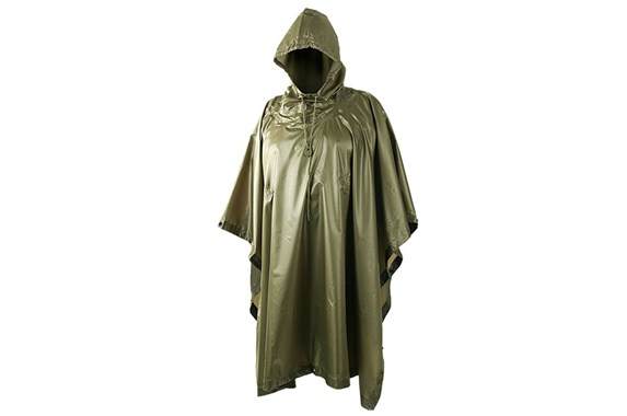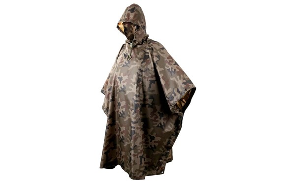 Regntät, snabbtorkande poncho, tillverkad av Rip-stop polyester. Den har tryckknappar som möjliggör en kombination av två ponchos. Huvan är utrustad med snörjustering. Den stora fördelen med ponchon är att den är lätt och storleken är liten när man viker ihop den - förpackad i en påse med måtten 14 x 22 cm