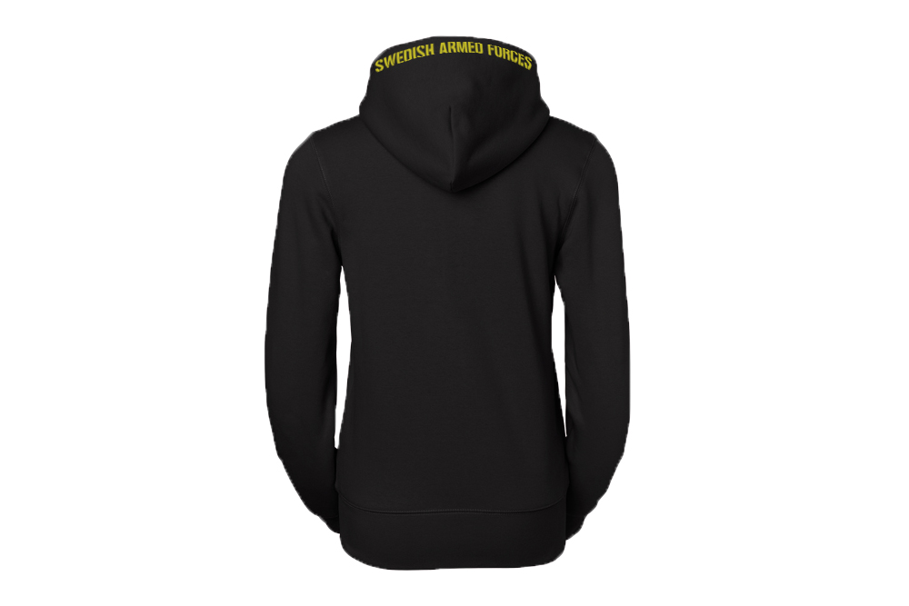 Munkjacka med dragkjedja och SAF & Swedish Armed Forces tryck. På armarna Tre kronor och "felvänd" svensk flagga. Att flaggan är felvänd ses som en symbol för medvind i strid.