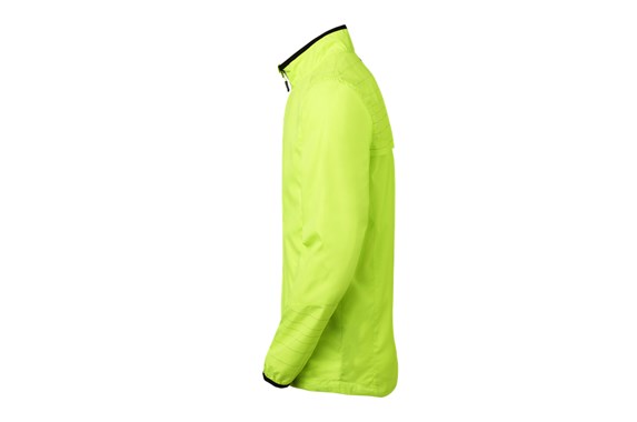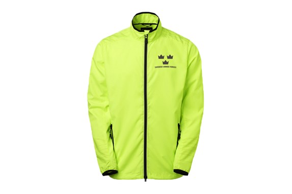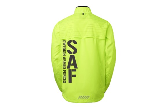 SAF-Vindtålig träningsjacka med invävd reflextråd vid axel, rygg och ärmslut för att öka synligheten i mörker. Tvåvägsdragkedja fram med reflex. Mesh i ryggen för ventilation. Matchande zip-pullers med invävd reflextråd. Sidfickor med dragkedja. Jackan kan vikas in i sidfickan och är enkel att ta med på träningen.