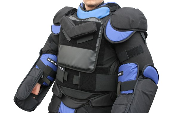 Byxorna är konstruerade för att öka skyddet för den nedre delen av överkroppen. Ljumskskyddet är integrerat i byxorna. Bröstskyddet är enkelt att ta på och av, vilket tillåter att användaren kan röra sig fritt och utdela slag tillbaka.