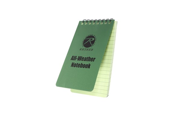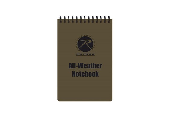 Write in any weather with Rothco's spiral Waterproof All-Weather Field Notebook. The notepad features a PVC cover with waterproof bonded paper, making it ideal for taking notes in any weather. Your writing won't wipe off due to water, sweat, humidity, or grease, while the paper won't disintegrate when completely wet. It is perfect for soldiers, tactical professionals, camping enthusiasts, or anybody who wants a reliable, weatherproof notebook. Write with a pencil or all-weather pen to keep your notes intact; standard ballpoint pens will work only when the paper is dry.