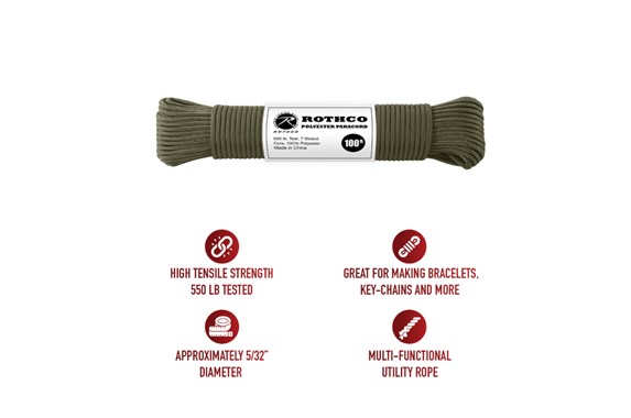 Rothcos 550lb Type III Paracord är ett multifunktionellt verktyg för din överlevnadsutrustning. Med en oslagbar draghållfasthet på 550 lbs är denna paracord viktig för servicepersonal, backpackers, campare och friluftsentusiaster. Den sju-trådiga konstruktionen tillåter demontering för olika applikationer som t.ex. fiskelina, skosnören och sygarn. Skapa armband, nyckelringar och tillbehör med denna mångsidiga paracord. Cirka 3,9mm i diameter, det är ett pålitligt tillskott till din ryggsäck och överlevnadsutrustning. Utrusta din vardagliga väska (EDC) med Rothcos 550lb Typ III Paracord.
